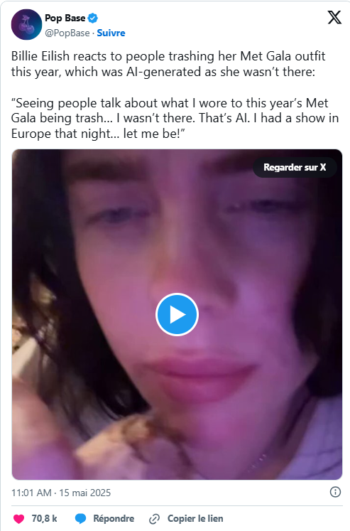 La superstar américaine Billie Eilish, qui n’était pas présente au dernier Met Gala, s’est sentie obligée de répondre ce mercredi 14 mai à une avalanche de commentaires désapprobateurs de ses fans concernant ses prétendues tenues. Dans une story Instagram depuis disparue, la chanteuse s’est insurgée avec humour : « Voir les gens parler comme de la merde de ce que j’ai porté au Met, alors que je n’y étais pas. C’est de l’IA. J’avais un concert en Europe ce soir-là. Laissez-moi vivre ! Je n’étais même pas là ! », avant d’éclater de rire face à sa caméra.